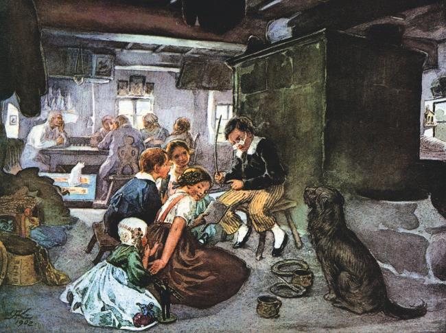 Но на печке уже царила тишина, потому что дети играли в папу и маму: молоденькой маме аист принес младенчика, и Аделке, которая не умела еще готовить свадебное угощение, поручили роль повитухи, а Вилим и Ян стали крестными; ребенка нарекли Гонзой. Затем был пир горой, и все ели, пили и всячески задабривали пострадавшую собаку. Гонзичек очень быстро вырос, и папенька повел его в школу, а Ян стал учителем и учил его читать по букварю. Но один-единственный ученик – это слишком мало, учиться-то всем надо, так что было решено немедленно играть в школу. И вот у Яна прибавилось учеников, но никто из них не делал домашнего задания, так что пан учитель сердился и бил лентяев по рукам линейкой. Ну что ж тут поделать: раз по-другому нельзя, то все с этим смирились; однако пес, который, хотя тоже пошел в школу, вообще не желал учиться, а только сопел на всю печку, был наказан дополнительно: ему на шею повесили черную позорную дощечку. Из-за этого мохнатый нарушитель дисциплины так рассердился, что спрыгнул на пол, ужасно грохоча своим символом позора. Помощник мельника в испуге вскочил со скамейки, бабушка сплюнула через левое плечо, а пан отец, погрозив в сторону печки табакеркой, крикнул: