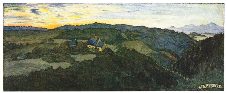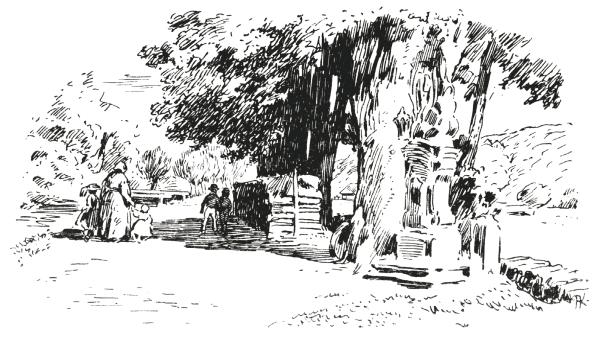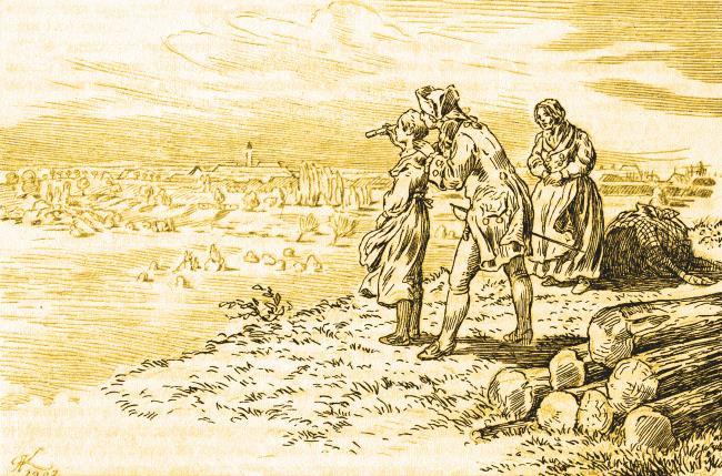 В воскресное утро дорога в городок, пересекавшая луга, всегда многолюдна. Вот ковыляют по ней старушка в шубейке и платке и опирающийся на палку старик, в волосах которого, по прихоти давней моды, торчит гребень. А вот идут женщины в белых чепцах с «голубками»; их быстро обгоняют мужчины в барашковых или щегольских выдровых шапках – они торопятся поскорее перебраться через длинный мостик на ту сторону, где зеленеет косогор. С него спускаются, пританцовывая, легким, как у ланей, шагом веселые девушки, за которыми еле поспевают удалые парни. Тут и там мелькают среди деревьев пышные белые рукава, алые ленты, приколотые к плечу, пестрые курточки юношей… пока наконец вся веселая стайка молодежи не выскакивает на зеленый луг.