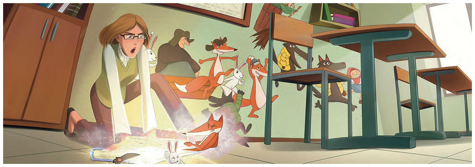 И тут Макс заметил Марию Петровну в конце кабинета на полу у шкафа. Учительница изо всех сил прижимала к полу книгу, удерживая внутри готовых выпрыгнуть наружу героев.