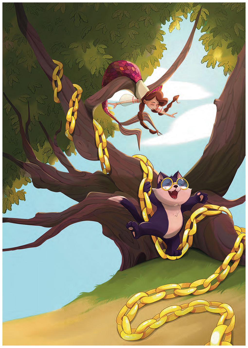 Максу даже показалось, что он захлебнулся водой, таким резким был аромат соли. Но он очутился не в море и не в океане, а на берегу. Юный детектив, конечно, читал, что Лукоморье – это сказочный залив. Но Макс никак не ожидал, что пляж так похож на обычный курорт. Только посередине песчаной отмели стоял огромный дуб. На ветвях висела толстая цепь, на которой плясал кот и крутилась русалка, вытворяя странные акробатические трюки.