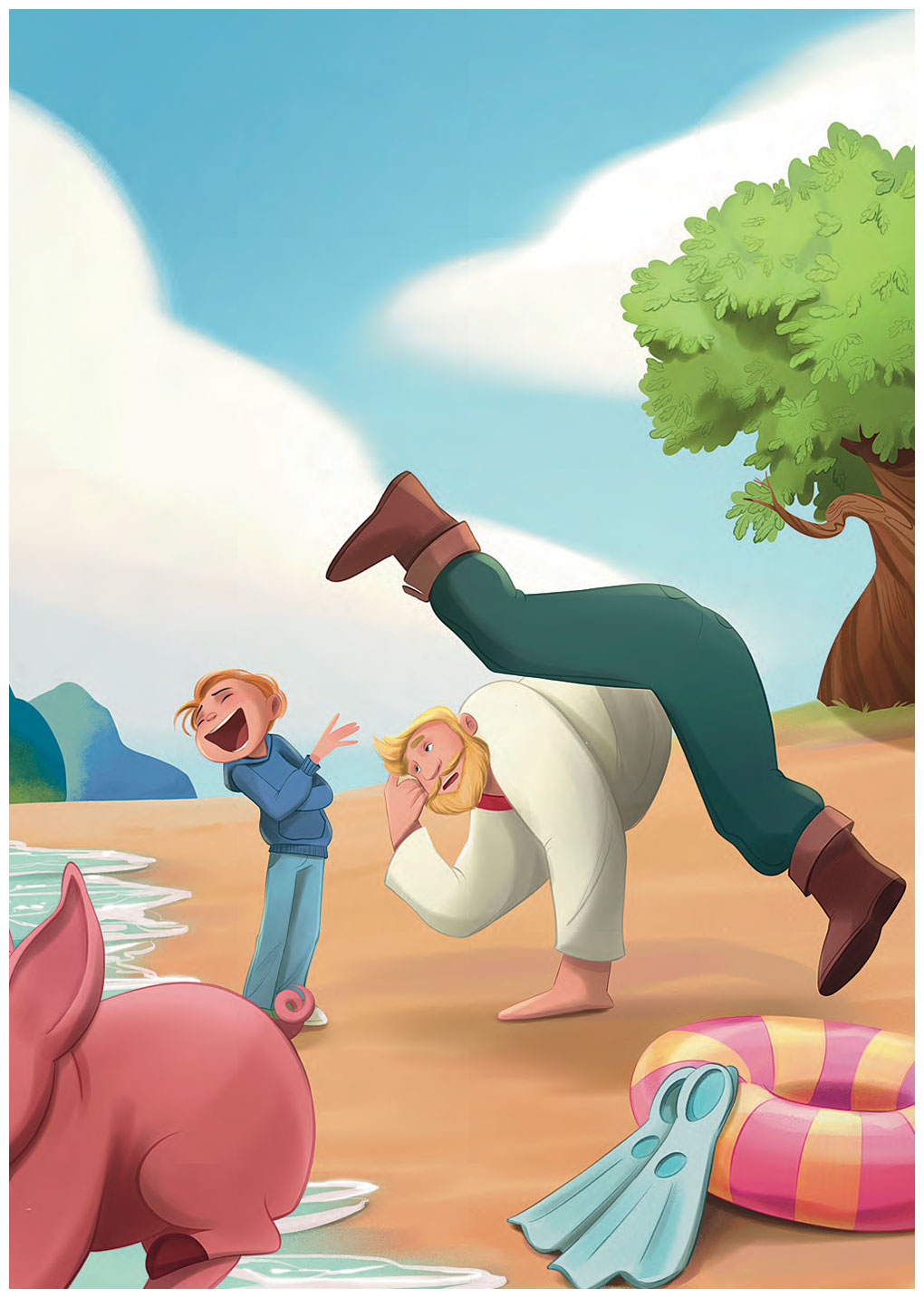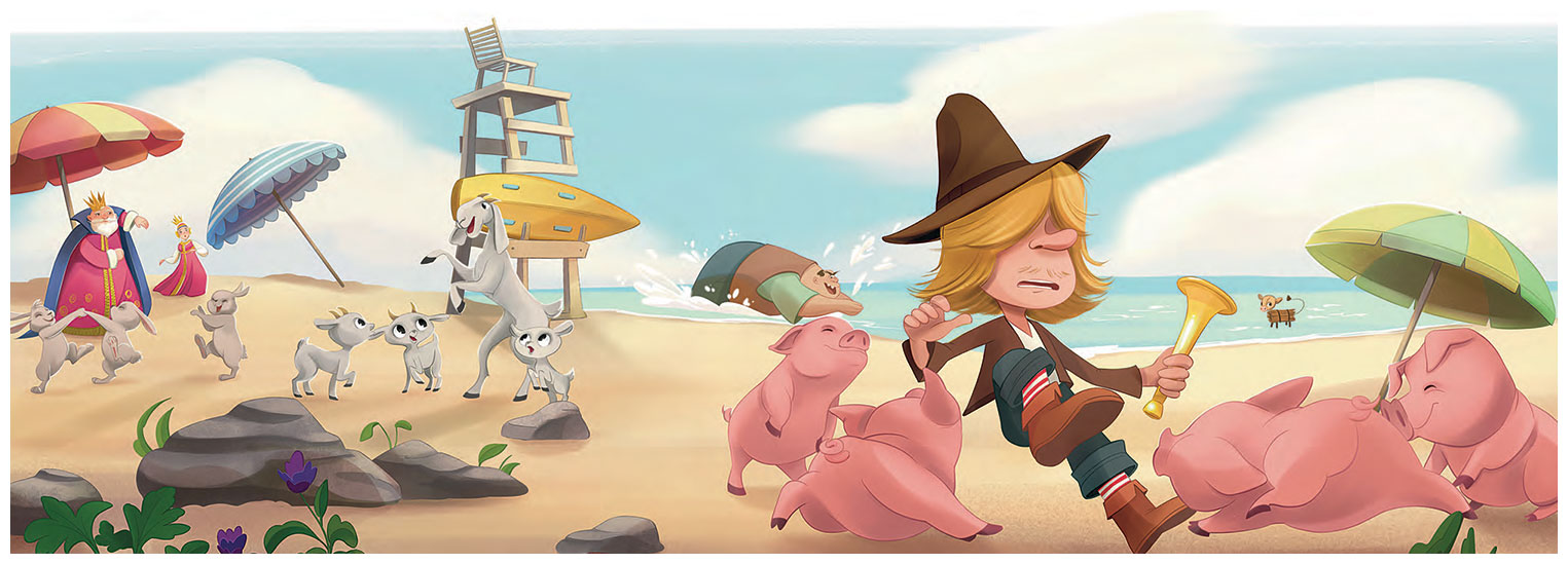 Макс стал изо всех сил пробираться к дубу, потому что на побережье было полно разного сказочного люда. Все пели и танцевали. Кто-то, правда, лежал в тени дерева, но всё равно трясся и дёргался, словно его била лихорадка. Большинство отдыхающих забрались в море и плескались не останавливаясь. Всё это напоминало костюмированную сказочную вечеринку в летнем лагере. Кого тут только не было! Бычок – смоляной бочок качался в прибое, за него держался Мальчик-с-пальчик. Дальше – Коза со всеми козлятами, Свинопас со свиньями. Поодаль фыркало королевское семейство, а на глубине нырял людоед.
