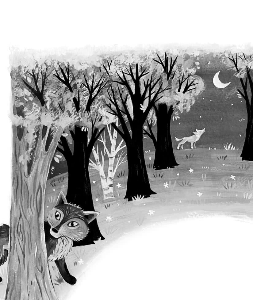 На лес опустилась ночь. На опушке сидел волчонок и прислушивался. Далеко в деревне плакал в колыбели ребёнок. Пищали комары, забиваясь в щели старого пня. Под кустом храпел медведь. Глубоко под землёй шептались мыши. Волчонку не спалось. Ему мешал огромный светящийся диск. Он висел над лесом, как громадное дупло в стволе старого дерева.