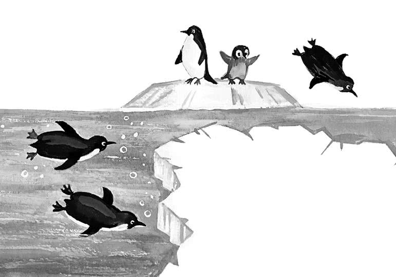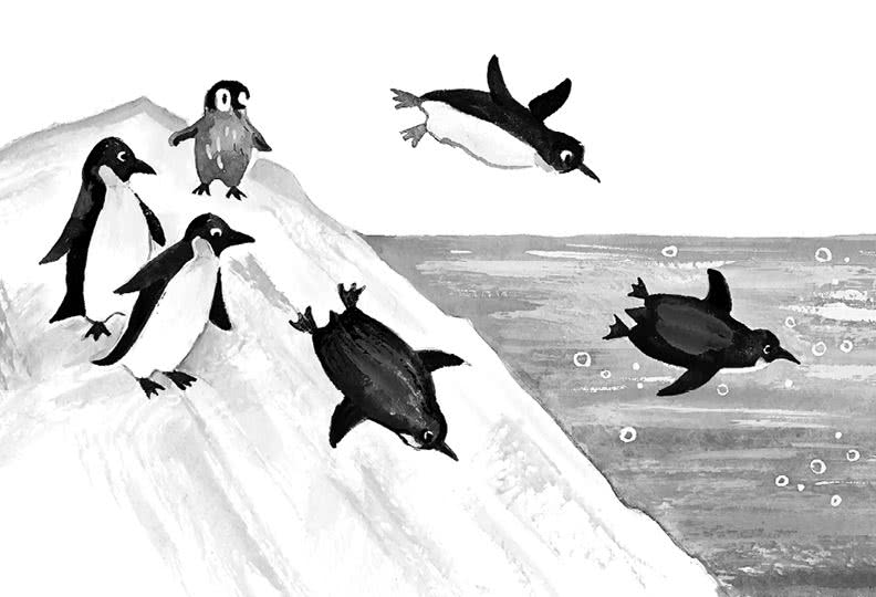 Пингвинёнок старался держать спину очень прямо, чтобы не упасть. Он переваливался из стороны в сторону и неуклюже шёл маленькими шажками. Наконец лёг на живот, оттолкнулся крыльями и быстро заскользил по льду. Вскоре малыш добрался до мамы и уткнулся клювом в тёплый живот.