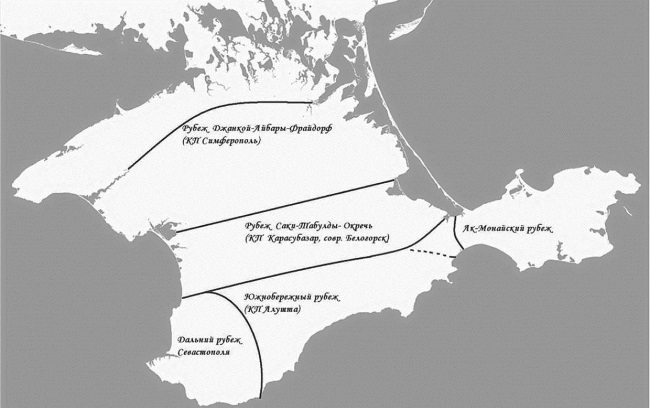 Расположение промежуточных рубежей, создаваемых в соответствии с директивой Ставки (Джанкой – Айбары – Фрайдорф, Саки – Табулды – Окречь, Ак-Монайского и Южнобережного) на Крымском полуострове