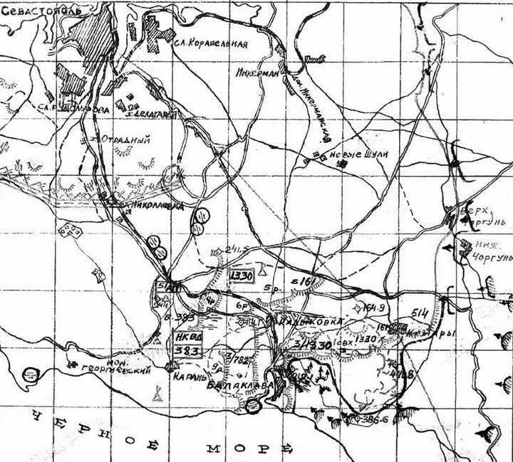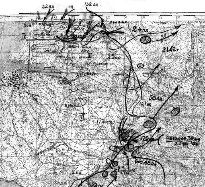 К сожалению, советская разведка работала очень плохо. Для примера приводится фрагмент карты, составленной по донесениям командования СОР. На ней, под Севастополем показаны и 46-я пд, и 132-я пд, и 170-я пд, и даже 30-я дивизия СС. Зато показан уход 50-й пд и 24-й пд, которые, по факту, оставались на месте.