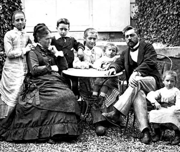 Гюстав Эйфель с женой и пятью детьми в саду своего дома в Леваллуа-Перре (Париж). Его жена Маргарита Годле умерла в 1877 году в возрасте 32 лет.