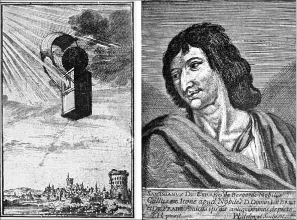 В трудах Сирано содержится и много других достаточно странных технических описаний. Он много внимания уделял ракетной технике и другим средствам перемещения в космосе. Анализ этих описаний позволяет выделить семь основных видов передвижения. Если дать волю фантазии, оставаясь при этом в рамках современных научных представлений, то можно предположить, что первый способ полета основан на испарении какой-то жидкости под действием тепла или другого источника энергии; второй способ – на расширении и воспламенении некоего рабочего тела внутри замкнутого объема с помощью специального устройства «икосаэдра» с оптической системой линз. Третий способ – движение с помощью механизма, преобразующего энергию взрыва в поступательное движение с огромной скоростью. Четвертый способ – полет на воздушном шаре. Пятый, шестой и седьмой способы полета, возможно, основаны на гравитационном взаимодействии тел.