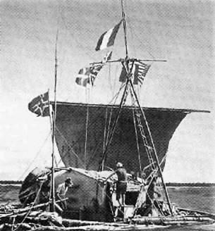 Шесть мужчин и попугай теснились в крошечной бамбуковой каюте, а спали на соломенных матрацах и камышовых циновках. Издали их судно напоминало «старый норвежский сеновал… полный бородатых головорезов». Первоначальные волнения о том, что лаги промокнут или веревки перетрутся, оказались необоснованными, но трудно было управляться с длинным, тяжелым направляющим веслом. Команда встречалась с опасностями, например, пришлось сражаться с огромной китовой акулой; во время шторма один из путешественников упал за борт, но все-таки был спасен; а вот попугая смыло за борт, и больше никто его не видел.
