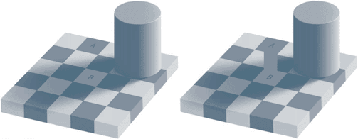 Моя любимая иллюзия. Посмотрев на первую картинку, вы никогда не поверите, что квадраты, отмеченные буквами А и В, имеют абсолютно одинаковый оттенок серого цвета. Это мы можем увидеть на втором изображении. Дело в том, что так работает наш мозг. На квадрат В падает тень без резких границ, и благодаря более темным соседним квадратам и плавному градиенту тени кажется, что этот квадрат значительно светлее квадрата А.