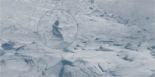 Эта фотография, сделанная марсоходом «Спирит», вновь возбудила больную фантазию многих. Кто-то видел на изображении снежного человека, а кто-то – инопланетную русалку, сидящую на камне. И вновь теории заговора и обвинения в том, что NASA намеренно скрывает доказательства существования разумной жизни на Марсе. Однако это всего лишь маленькое каменное образование, сформированное ветром.
