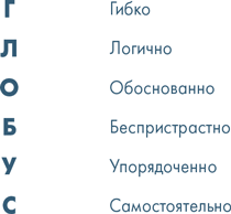 Кстати, относительно последней буквы ГЛОБУСа у нас в Школе критического мышления шли большие споры. Мои коллеги-преподаватели предлагали букву С интерпретировать как свободно. Это тоже справедливо, но я бы оставил все как есть. Просто добавил бы: если ты мыслишь гибко, логично, обоснованно, беспристрастно, упорядоченно и самостоятельно, ты получаешь главное – настоящую СВОБОДУ. А что может быть важнее?
