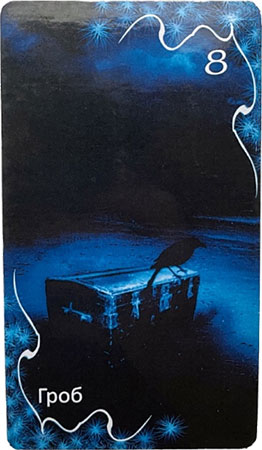 Чакра: ресурса на чакре нет. Энергия отсутствует. Если карта выпадает в раскладе «Диагностика чакр», то может говорить о некротической энергии. Может показывать кладбищенскую сущность.