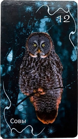 На карте мы видим одинокую сову с желтыми глазами, сидящую на ветке в ночном лесу. Создается двоякое впечатление о карте. С одной стороны, она имеет негативное значение. Совы – символ ночных хищников. Карта сомнений и постоянного выбора. Опасения и размышление. Разговоры, сплетни и интриги. Достаточно серьезные. Сова не суетится, это грозный ночной хищник. Если плетутся интриги, то недооценивать степень их негативного влияния на кверента нельзя. Одновременно Сова – символ мудрости, при общении можно получить важный и нужный совет. Как проиграется эта карта, зависит от соседних карт.