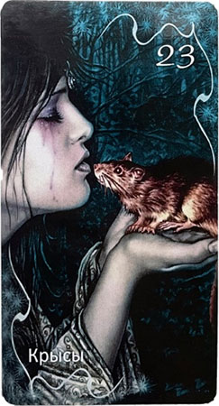 Одна из ярко негативных карт. На карте изображена женщина с подтеками туши на щеках, она держит крысу и целует ее. Нерадостная карта, как будто идет смирение с ситуацией.