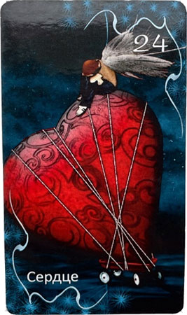 На карте мы видим большое алое сердце, но оно перевязано крепкой веревкой, и на самом верху сидит маленький мальчик с крыльями. Сердце – символ любви и нежности, добрых чувств, позитивных эмоций.