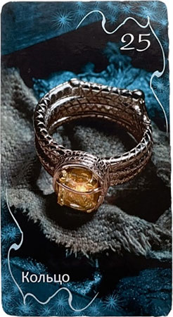 Кольцо – карта больше нейтральная, она подвержена влиянию окружающих карт. Когда возникают вопросы в раскладах стабильности и официальности, брака – ответ «да». Когда вопросы связаны с изменением ситуации и движением, то ответ «нет», так как карта символизирует еще цикличность. Покажет заморозку ситуации и ведение по кругу в негативном окружении карт.