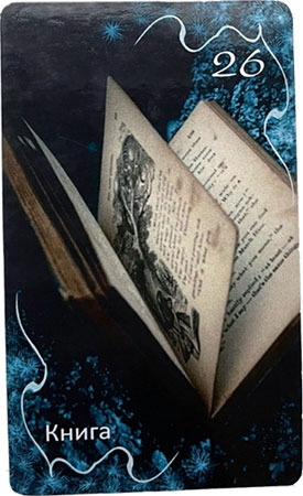 Карта нейтральная, и на ней мы видим книгу с раскрытыми страницами. Символ карты – знания и тайна. Раньше чтение и знания были уделом избранных, фактически тайным и магическим действием, несли сакральный смысл. При выпадении в раскладах карта говорит о том, что есть скрытые факторы; лучше вытащить дополнительную карту. Символизирует магию и вообще тайное, скрытое от вас или от всех намеренно. Прежде чем совершить любое действие, необходимо тщательно изучить все. Также карта покажет важность получения знаний и навыков.
