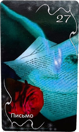 Карьера и денежные дела: оформление официальных документов и бумаг. Заключение договора в бизнесе, между рабочими партнерами. Это связь, факсы, письма, статьи, телефонные разговоры, посты и блоги в интернете. Работа с бумажными документами; в прогнозах будущего – ожидайте поступление новой информации, какой именно – укажут соседние карты. В денежных вопросах карта Письмо может указать на банковские счета и переводы, чеки.