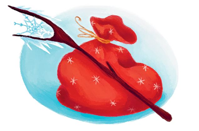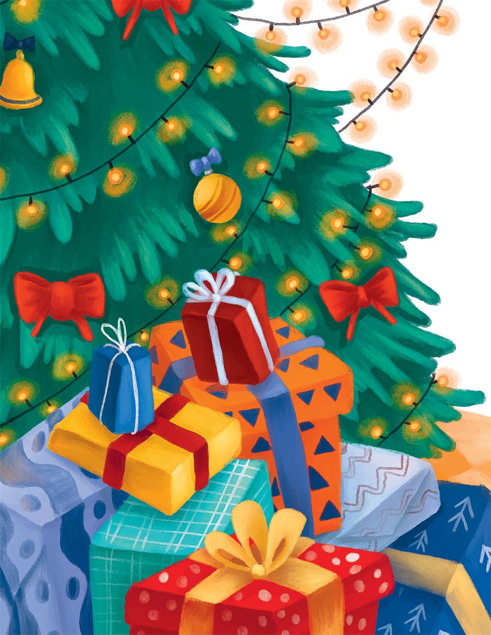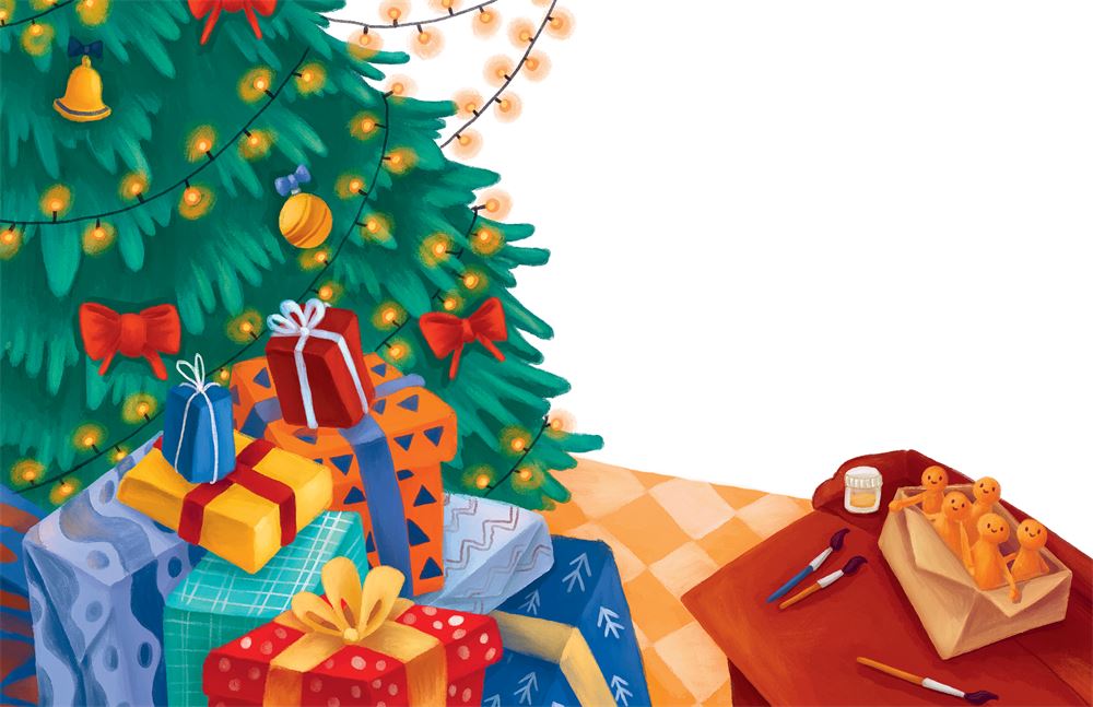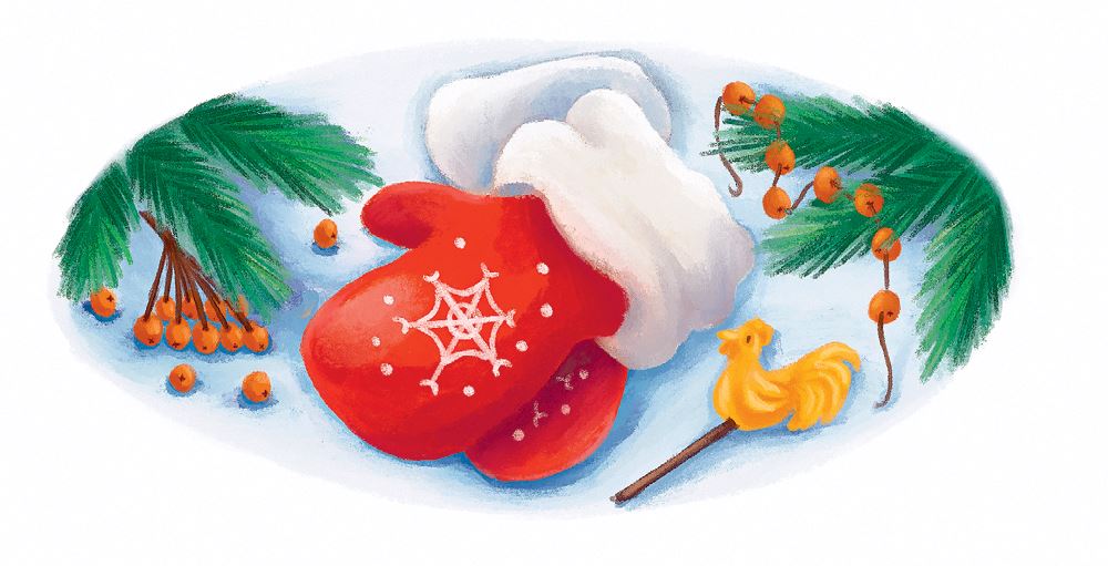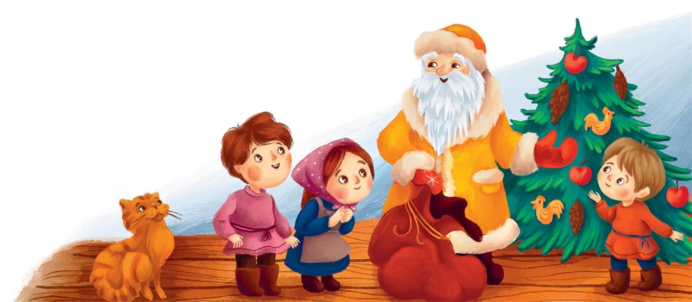 Дохнуло тут морозом на всю избу. Дети испугались – ну всё, заморозит их дед за то, что ёлки нет, узелком с монетками от него не откупишься… А присмотрелись – среди полутёмной избушки ёлочка появилась. Маленькая, пушистая, а на ветках и пряники висят, и орехи золочёные, и леденцы, и яблоки, ниточками привязанные. Кто ещё такой подарок может сделать? Только один человек, дедушка любимый. Так что, это и правда он?.. Потому что достаёт он из мешка ещё подарки: кому лошадку деревянную, кому куколку, а кому свисток. Вот так подарочки!