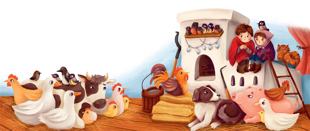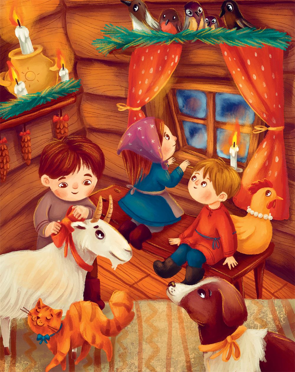 А в той избушке жили дети-сиротки. Родители их умерли, остался один дедушка. Сегодня рано утром ушёл он в город, обещал заработать денег и вернуться с подарками. И сидели детишки, ждали его. Затопил им дедушка печку, но мороз-то какой – остыла печка. А дедушки всё нет. Холодно детям, страшно. Уж они и коровку свою из хлева в дом завели, и гусей запустили, собаку, кур, поросёнка. Кота и приглашать не пришлось – он первым, когда ещё печка горячей была, лучшее местечко на лежанке занял. Даже птиц дети в избу взяли – вот и сидели теперь у них ворона, две галки, четыре синички и полтора десятка воробьёв. Маленькие друзья, весёлые уличные чирикалки.