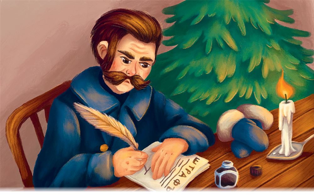 Уселся он за стол, вынул из рукавицы книжицу, из кармана чернильницу, перо из-за уха достал. Вырвал из книжицы листок. Обмакнул перо в чернила и принялся писать. Язык высунул, старается.