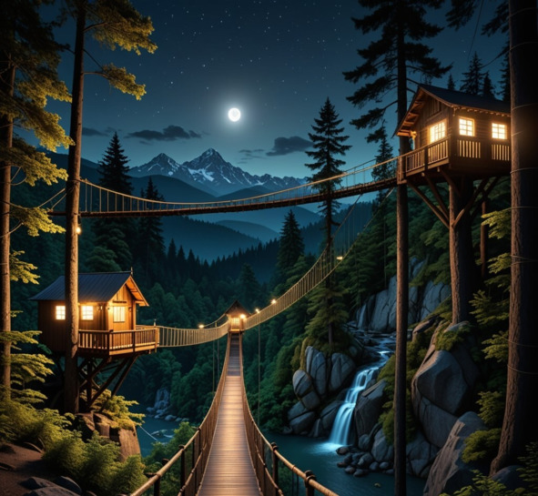 Никто мне не ответил, мы двинулись дальше. Сначала мы прошли по коридору, затем поднялись по лестнице, снова по коридору и вышли на улицу. На стенах что-то светилось, тем самым освещая пространство вокруг. По ощущениям, будто бы мы вышли с обратной стороны скалы и попали во двор их каменного дома. Этот двор был очень большого радиуса и, казалось, что со всех сторон окружён скалами. Внутри этого огромного пространства были высокие и толстые деревья. Также здесь разместились маленькие отдельно стоящие скалы, с деревянными лестницами, подвесными мостами и фонариками. С разных высот, будто игрушки на новогодней ёлке, свисало нечто деревянное, похожее на домики, возможно, в них тоже жили эти зверьки.