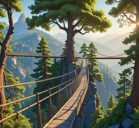 И мы пошли по лестнице наверх. Когда поднялись, остановились у дверного проёма, который вёл наружу, но двери не было. Иллийцы шагнули первыми, я подошёл к краю и увидел, что это подвесной мост, и он ведёт на смотровую площадку на дереве.