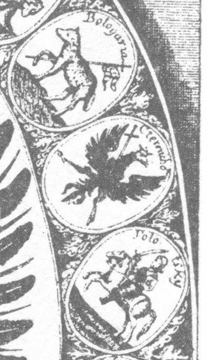 Есть две основные версии, почему символом Черниговского воеводства стал двуглавый орел. Одни исследователи доказывают, что двуглавый орел является древним символом черниговской земли: известно изображение двуглавого орла на турьем роге, найденном при раскопках кургана Черная Могила, двуглавые орлы изображались также на стенах Борисоглебского собора в Чернигове. Другие считают, что все гораздо проще – двуглавый орел был выбран поляками для герба отобранной у Москвы земли исключительно для того, чтобы подразнить московского самодержца.