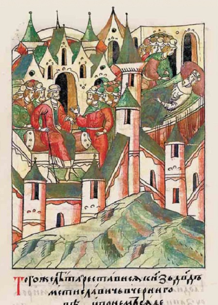 Съезд в Исадах. Миниатюра из Лицевого летописного свода XVI в.