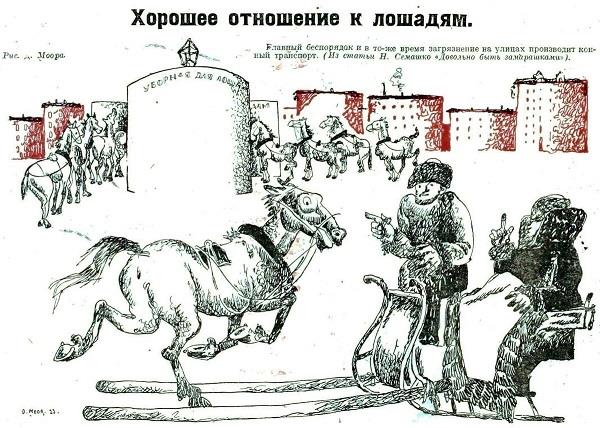 Главный беспорядок и в то же время загрязнение на улицах производит конный транспорт. (Из статьи Н. Семашко «Довольно быть замарашками»).