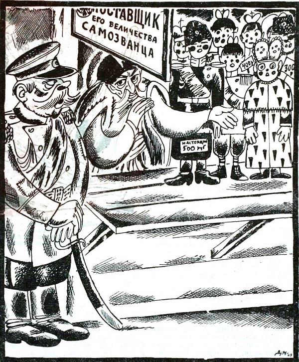 Безымянная карикатура Д. Моора посвящена Николаю Маркову, более известному как «Марков-второй», или, по версии левых, «Марков-валяй».