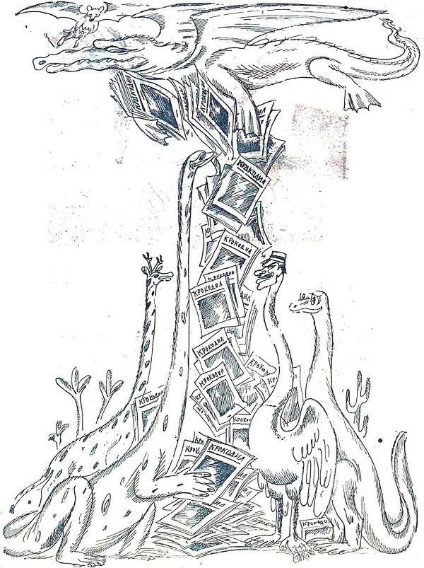 Крокодил (допотопным животным): —Здравствуйте, здравствуйте! Мы теперь с вами—коллеги: Животных таких размеров, как вы, не знала наука, да и крокодилов, которые из ротационных машин вылетают, – наука также не знала!..