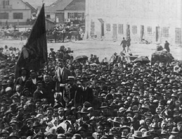 После распада Австро-Венгерской империи возвращается на малую родину и вот там то, на многотысячном митинге в городе Тарнобжеге, вернувшийся фронтовик Домбаль и опальный ксендз Оконь объявляют о создании Тарнобжегской советской республики. Вот фото этого митинга. Пишут, что выступает ксендз Эугениуш Оконь, но я сомневаюсь. Он, по-моему, ниже оратора стоит.