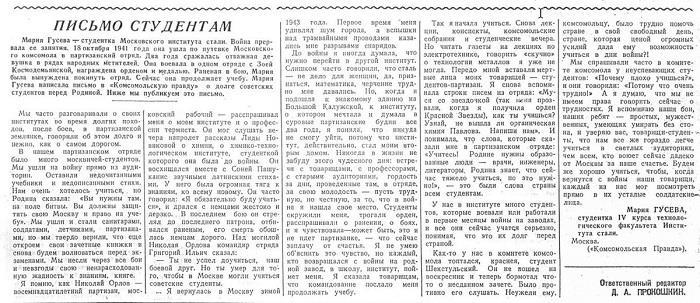 В общем, все было нормально, учеба шла, но в конце 1944 года в «Комсомольской правде» вышла статья с названием «Письмо студентам», подписанная «Мария ГУСЕВА, студентка IV курса технологического факультета Института стали».