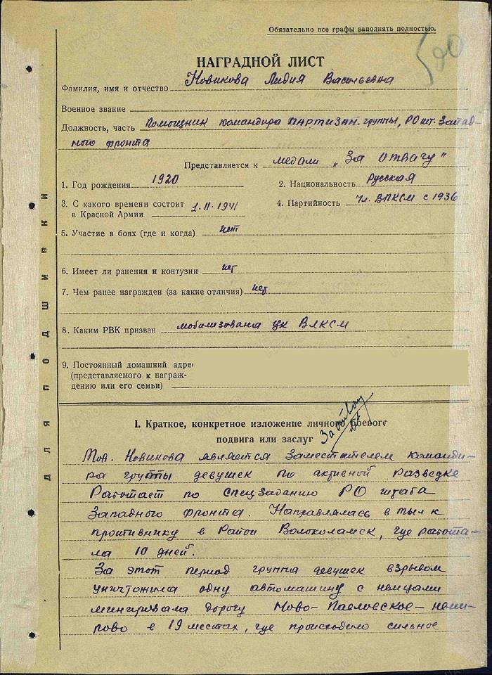 Новикова Лидия Васильевна, уроженка хутора Зыково под Саратовом. Студентка Менделеевки, будущий химик. Лиля, напротив, одна из самых взрослых в отряде, 1920 года, ей УЖЕ 22. Подпольная кличка – «Кнопка», из-за маленького роста. Один из лучших бойцов в отряде, не зря ее назначили заместителем командира второй девичьей группы. Две медали «За отвагу», представляли к «Красной Звезде» – но тоже не дали.