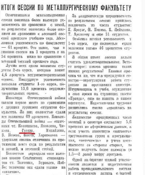 И вновь у «Муси со звездочкой» слова не расходятся с делом. В те годы в институтской газете обязательно писали об итогах сессии. Процитирую один абзац из заметки «Итоги сессии по металлургическому факультету» в газете «Сталь» № 27 за 1945 год: