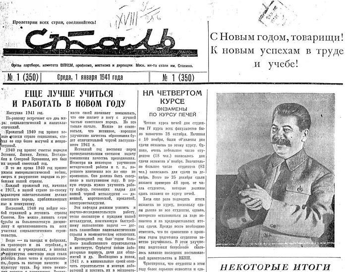 1941 год, который еще не был тысячекратно проклятым, в Московском институте стали имени Сталина начался вот с этого номера, вышедшего 1 января.