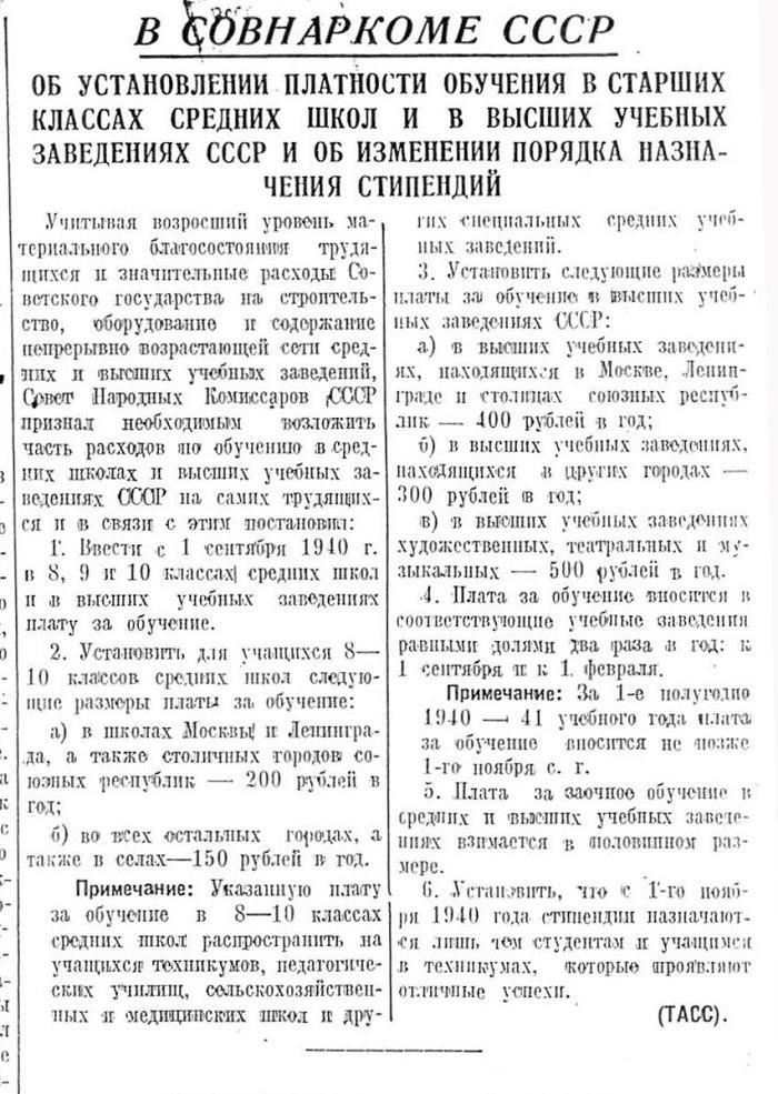 1940 год стал для советской системы образования рубежным, разделившим все на «до» и «после». 2 октября 1940 года вышло постановление Совнаркома «Об установлении платности обучения в старших классах средних школ и в высших учебных заведениях СССР и о изменении порядка начисления стипендий».