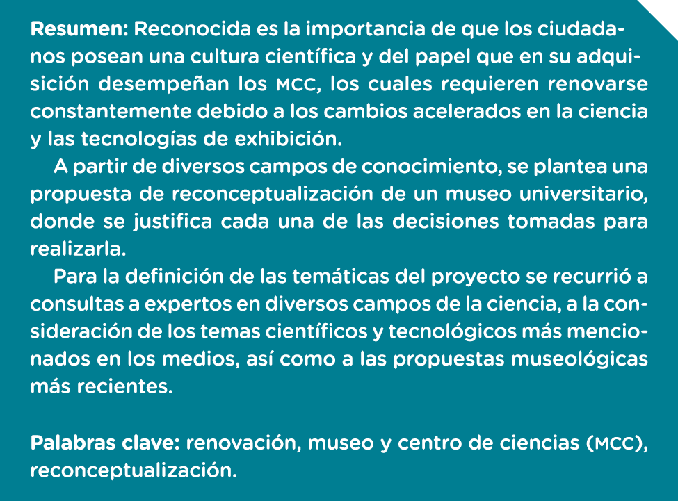 Esta contribución se inicia con el cada día más firme conocimiento que se tiene acerca de la importancia de que los ciudadanos posean una cultura científica y el papel que los MCC juegan en su adquisición, dada la reconocida falla de la escuela formal para lograrlo. Enseguida se menciona que a pesar de ofrecer una alternativa para la educación científica informal de todos los ciudadanos, los MCC están sometidos a una fuerte competencia si no se renuevan. Afortunadamente los estudios que se han realizado en estos espacios han sugerido los caminos que se deberían seguir para sortear este problema (Bradburne, 1998) y que han sido tomados en cuenta en esta propuesta.
