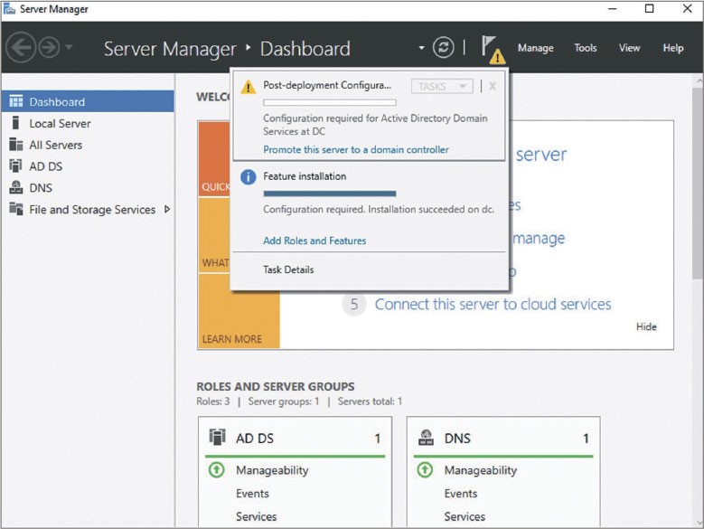 После установки нажимаем на кнопку Close. В верхнем правом углу появился желтый восклицательный знак, который указывает нам, что роли требуют завершения настройки (рис. 1.4).