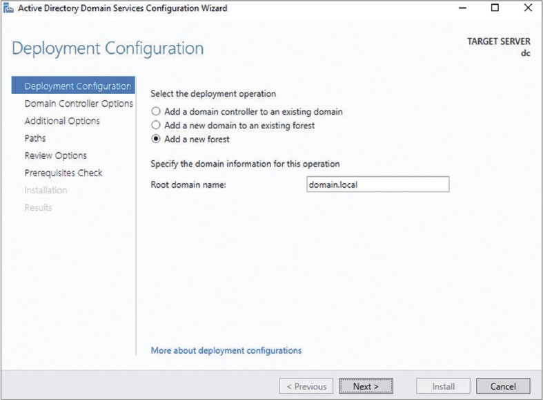 Нажимаем на ссылку Promote this server to a domain controller. Появляется окно с выбором, куда добавить контроллер домена. Так как у нас ничего нет, выбираем Add a new forest и вводим имя домена domain.local (рис. 1.5).