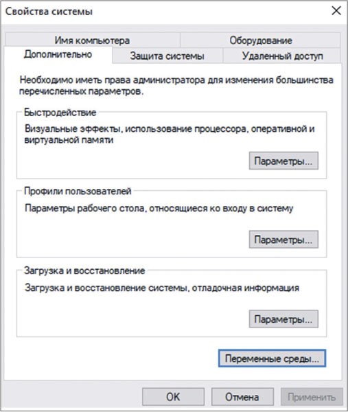 Для начала нужно скачать скомпилированный дистрибутив OpenJDK 11 с официального сайта[5]. Распакуем архив в директорию C: \Program Files\openjdk\. Теперь необходимо прописать пути в переменных окружения. В командной строке с правами локального администратора нужно выполнить sysdm.cpl, перейти во вкладку «Дополнительно» и нажать на переменные среды.