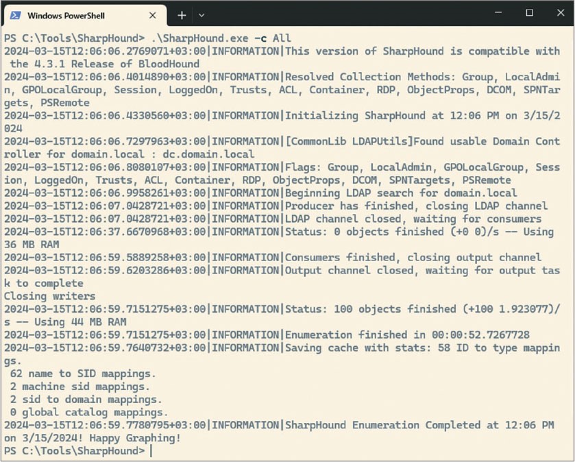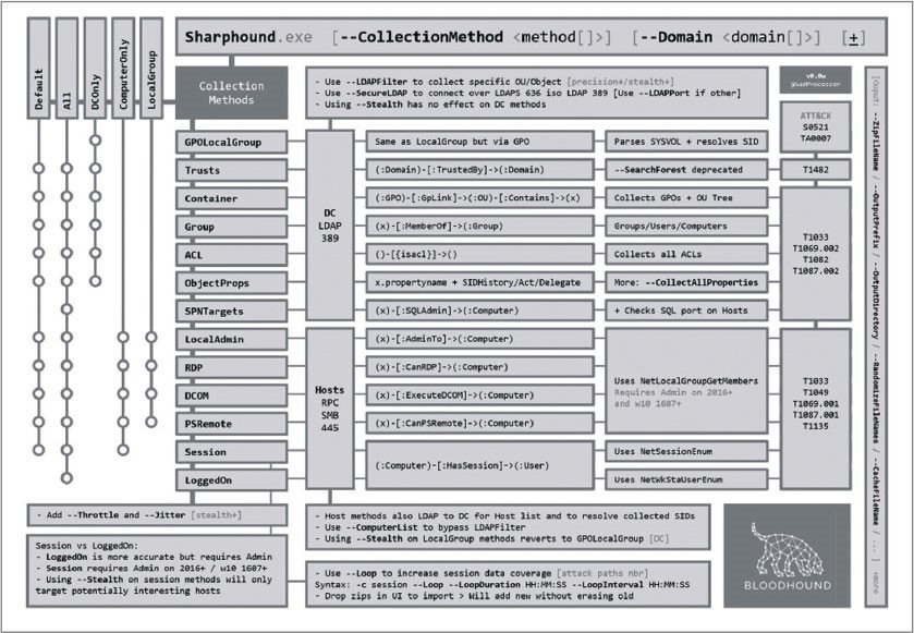 SharpHound – это консольное приложение, написанное на C#. SharpHound собирает информацию об объектах домена через запросы LDAP, а также информацию с хостов, такую как членство в локальных группах и сессиях.