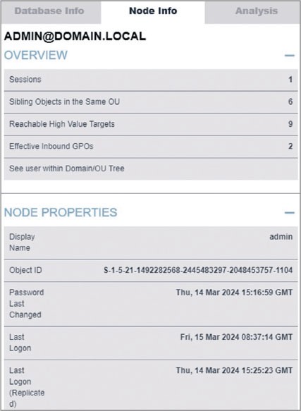 В этой вкладке отображаются свойства узла. Кроме того, в ней выполняются некоторые Cypher-запросы, которые предоставляют статистические данные, например, для пользователей и компьютеров выдается информация о сессиях или коротких путях до узлов высокой ценности.