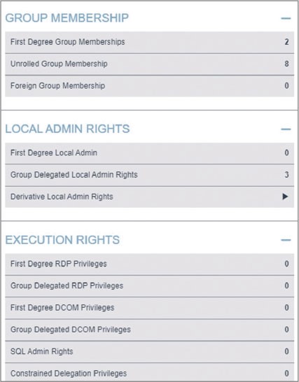 Разные типы узлов содержат разную информацию. Так, например, групповые политики содержат информацию, к каким пользователям или компьютерам они применяются, а у пользователей и компьютеров отображается информация о правах на другие объекты или правах, связанных с боковым перемещением (рис. 2.9).