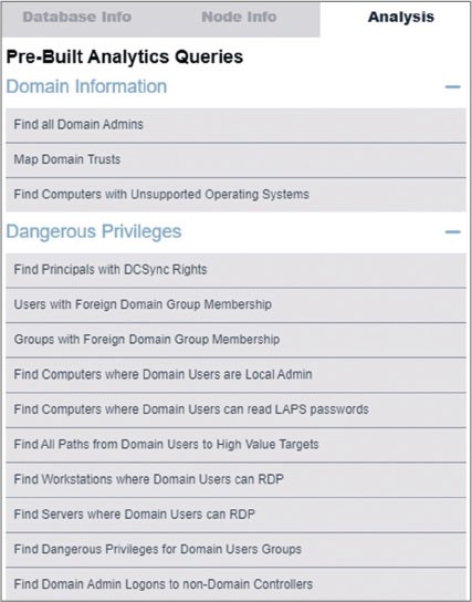 Вкладка Анализ (Analysis) содержит встроенные в BloodHound полезные запросы, с которых можно начать исследовать инфраструктуру Active Directory (рис. 2.11).