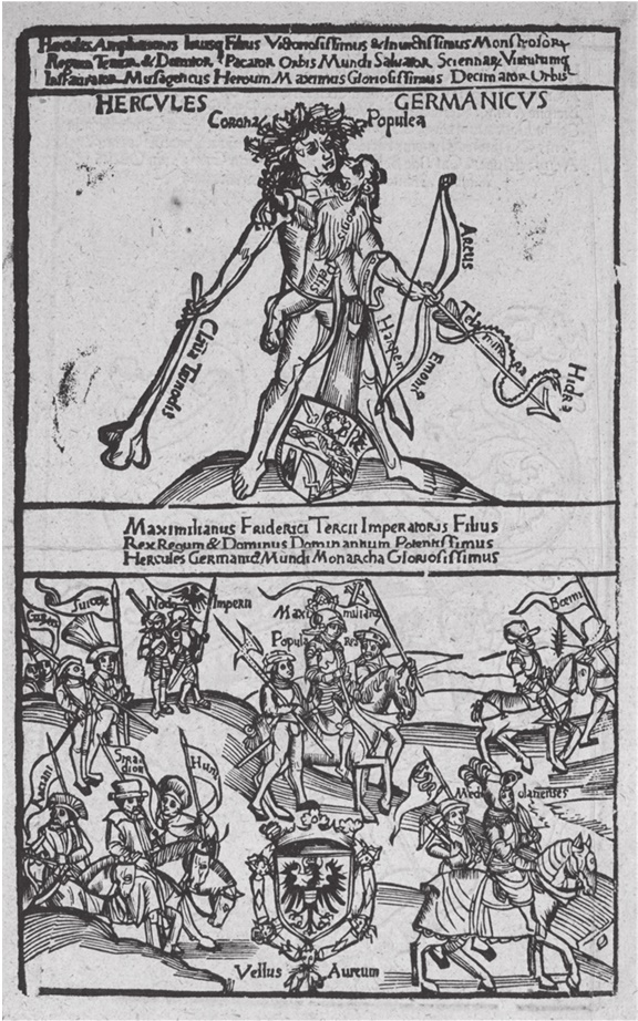 Для людей, живших в раннее Новое время, история служила основой для понимания настоящего. Престиж наций строился на выдающихся деяниях как предков, так и современников, и от историков ожидалось, что они смогут установить связь между древним величием и современными реалиями, чтобы создать величественную историю своего общества или своих нанимателей. Для жителей Северной Европы наиболее существенными источниками считались античные тексты Тацита, Плиния и других, кто описывал земли к северу от Альпийских гор. В этих текстах встречаются фантастические элементы, опровергаемые современными историками. Однако ранние историографы нередко считали эти пассажи весьма важными. Так, комментарий Тацита о том, что Геркулес побывал в Германии, а римляне называли земли, которые частично входят теперь в понятие Центральной Европы, отнюдь не считался милым, но малоправдоподобным анекдотом. Напротив, Максимилиан I, император Священной Римской империи (1493–1519), объявил его предком Габсбургов и велел изобразить себя на гравюре в виде «Германского Геркулеса» (Hercules Germanicus)6 (илл. 1) [Тацит 1969; McDonald 1976]. Родичи Максимилиана при дворах Испании и Бургундии не отставали и тоже заявили о родстве с этим полубогом [López Torrijos 1985; Brown, Elliot 2003 и др.]. В XVI веке история Лукиана о том, как Геркулес побывал в Марселе, вновь обрела актуальность и эволюционировала в традицию о «Галльском Геркулесе» (Hercules Gallicus), и его объявили предком французских королей [Лукиан 2001; Диодор 2021]7. Приписываемые ему качества – великая сила и мудрость – превратили его в идеал для всех правителей, и благодаря этому его образ стал универсальным, даже когда частные обстоятельства менялись.