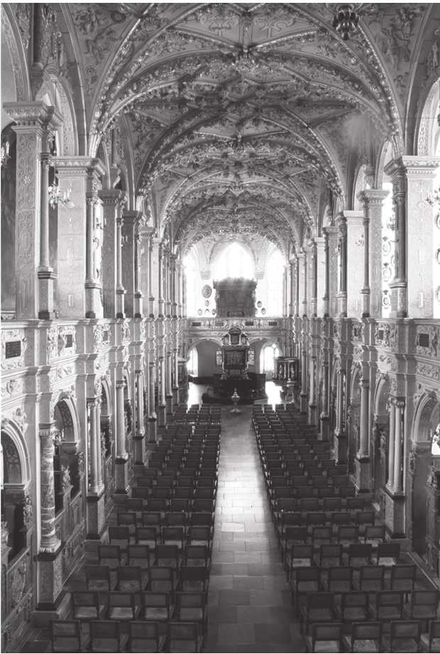 В Дании важное значение получило строительство капелл, что отражало близкие религиозные связи королевства с Саксонией. В 1544 году Мартин Лютер провел церемонию освящения замковой капеллы в Торгау (илл. 4). Пространство этой капеллы опоясывают галереи на двух уровнях, напоминающие внутренний двор с аркадами, увенчанный сводом. На этих галереях размещались прихожане, строго разделенные согласно своему рангу. На первой галерее, на уровне кафедры проповедника, сидел курфюрст Иоганн Фридрих со своей свитой. Над ними сидели князья, а внизу стояли другие придворные [Wex 1983: 16]. Изначально в капелле был небольшой престол, но в 1545 году его заменили большим алтарем из мастерской Лукаса Кранаха, выполненным вместе с рядом картин, также размещенных в капелле [Krause 2011; Krause 2004].