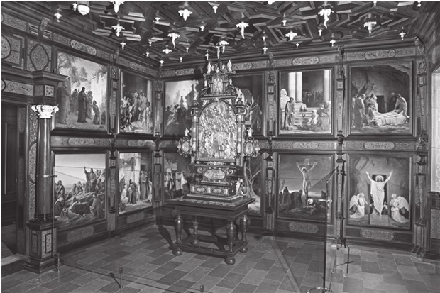 В Торгау статус курфюрста подчеркивался его местом на первой галерее. В Фредериксборге Кристиан устроил себе богатую отдельную молельню (илл. 6) [Johannesen 1974]. Здесь размещается второй алтарь, поменьше, также выполненный из серебра и черного дерева, и позолоченный евхаристический набор, которые служили для более личных религиозных потребностей короля. Двадцать три картины придворного художника Питера Исаакса, а также Питера Ластмана и других амстердамских художников изображают серию библейских сюжетов от Благовещения до Страшного суда и представляют собой нарративный аспект, который в значительной степени отсутствует в большой капелле, где вместо этого можно увидеть несколько табличек с текстами. Обрамлением этих картин стали стены из черного и гвоздичного дерева со сложными узорами из деревянной мозаики. Потолок, отделанный панелями, был инкрустирован серебром и украшен свисающими гроздьями фруктов и листьев из слоновой кости. Убранство завершает мраморный столик, украшенный каменной мозаикой. Только у короля имелись ключи от этой молельни, и подчеркнуто интимная природа этого молитвенного места наряду с выдающимся мастерством исполнения сближают эту молельню с другими, современными ей княжескими молельнями, например, с драгоценной Reiche Kapelle («Роскошная капелла» или «молельня») баварского герцога Максимилиана I, принадлежавшего к Католической церкви, или молельней в Дрезденской капелле, описанной Хайнхофером. «Роскошную капеллу», освященную в 1607 году, украшали серии сцен из жизни Девы Марии, выполненные по гравюрам Альбрехта Дюрера. Их выполнили из мраморной мозаики, и, таким образом, по материалу они отличаются от предметов искусства в молельне Фредериксборга. Более того, там хранились церковные реликвии герцога, и таким образом религиозные функции капеллы не соответствовали принятым в лютеранстве. Однако обе капеллы были безошибочно узнаваемы как пространства, созданные для правителей, и в них можно найти существенные черты сходства и помимо богатого убранства. Оба правителя молились перед тщательно проработанными алтарями из черного дерева и слоновой кости, в значительной степени сравнимыми друг с другом.