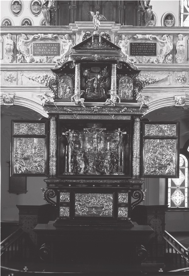 Алтарь в часовне Фредериксборга описывали как своего рода Kunstkammerstück, или диковинку (илл. 7) [Heym 2006]. Действительно, его основные элементы вполне похожи на изысканные кабинеты, которые производились в начале XVII века для князей и состоятельных коллекционеров. Барельефы также выполнены по наиболее ценным среди коллекциониров начала 1600 годов гравюрам: Альбрехта Дюрера, Хендрика Гольциуса и нескольких других. Гравюры брались за основу для многих работ на религиозные темы в раннее Новое время, но как минимум некоторые из них выглядят неуместными в этом сугубо лютеранском пространстве. Как представляется, особенно трудно примирить с протестантскими верованиями выполненное в Амстердаме Яном Мюллером по мотивам картины придворного художника Габсбургов Ханса фон Аахена изображение мученичества святого Себастьяна.